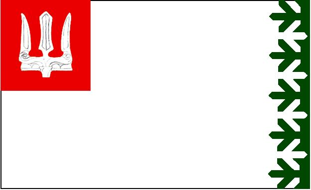 ВОЛХОВСКОГО РАЙОНА ГЕРБ И ФЛАГ, официально утвержденные символы МО «Волховский район» (герб – решением Собрания представителей МО от 25 февр. 1998 № 7; флаг – решением от 31 марта 1999 № 18). Геральдическое описание герба: «В серебряном поле зеленая сосновая глава и червленое, с закругленным концом острие треугольника, обремененное серебряным трезубцем». Сосны символизируют лесные угодья р-на, треугольник – курган «Олегова могила», шатрово-купольные главы Староладожской крепости, серебр. трезубец – слияние с Ладожским озером рр. Волхов, Сясь, Паша. Флаг представляет собой прямоугольное полотнище с соотношением дл. к шир. 1:2. Составлен на основе герба. В верх. части полотнища на белом поле в левом углу изображен трезубец, габаритная шир. трезубца на флаге составляет 1/3 длины полотнища, в правой части флага – зеленая сосновая глава. Герб внесен в Гос. геральдический регистр РФ под № 235, флаг – под № 450.