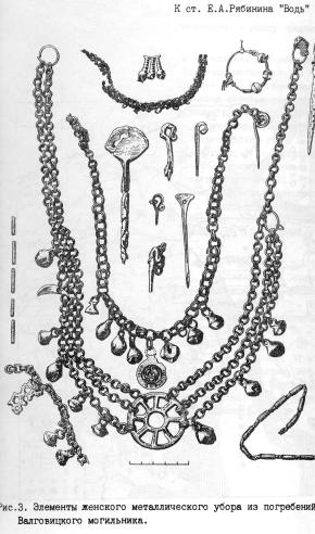 МОГИЛЬНИКИ ВОДИ. Погребальные памятники сев.-зап. води («чуди») исследованы Е.А. Рябининым в 1983-88 в быв. водском приходе Каттила (дер. Котлы Кингисеппского р-на). Древнейший тип представлен кам. могильниками I–III вв. К ним примыкают грунтовые могилы XII–XVII вв. с кам. оградками на поверхности. Погребальный ритуал характеризуется трупоположениями с зап. и вост. ориентировкой, порчей орудий труда. Жен. убор (нагрудные булавки и цепочки с привесками, орнаментация одежды спиральками, колечками, бляшками и др.) отражает локальные племенные традиции и имеет прибалт.-фин. облик. Славяно-рус. влияние прослеживается только в хоз. деятельности. Сев.-вост. водь, обитавшая на плодородных землях Ижорской возвышенности, оказалась в зоне массового сел. расселения словен и кривичей. В материалах древнерус. курганно-жальничных могильников XI–XV вв. можно проследить сближение чересполосно обитавших разноэтничных общин. Культурное влияние Новгорода способствовало формированию единой обл. культуры, что отразилось в элементах погребального ритуала и инвентаря. Юж. водь (предположит., «норова») обитала в cев.-вост. Причудье, между рр. Нарова и Плюсса. Древнерус. курганы распространяются здесь с XI–XII вв. В их культуре сочетаются славянские и прибалт.-фин. элементы. В теч. XII–XIII вв. под новгородским влиянием местные типы украшений заменяются общерусскими.