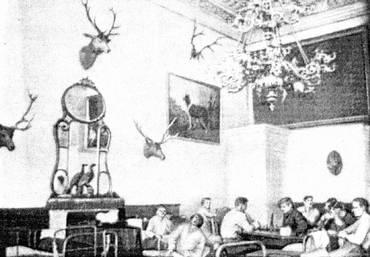 ОХОТНИЧИЙ ДВОРЕЦ (пос. Лисино-Корпус, Тосненский р-н). «Охотничий дом» (он же «дом для помещения приезжающих гостей»), сооружен в 1853-58 в комплексе казенной лесной дачи, все постройки к-рой проектировал Н.Л. Бенуа. Композиционное и декорат. решение дворца своеобразны и имеют черты, предвосхищающие стиль модерн. Внутренние помещения (кабинет, опочивальня, камердинерская и т. д.) скомпонованы вокруг центрального двусветного зала. В процессе внутр. отделки помещений уже готового дворца появилась необходимость его расширить, в связи с чем был пристроен двухэтажный корпус, к-рый соединен с дворцом галереей-залом. Интерьеры О. д. были представлены в журн. «Нива» за 1885. В камер-фурьерском журн. зафиксировано 87 посещений имп. Александром II О. д. в Лисине. В сов. время здание занимали лесная опытная станция (с 1931), а затем, вплоть до наших дней, – общежитие студентов Лесотехн. академии. Внутр. отделка утрачена, дворец нуждается в проведении реставрац. работ.