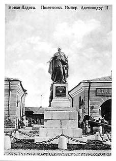 АЛЕКСАНДРУ II ПАМЯТНИК (г. Новая Ладога). Установлен 16 июня 1913 напротив Гостиного двора. Копия с пам. Александру II в Моск. Кремле (1898, скульп. А.Н. Опекушин). Имп. был изображен в полный рост в воен. мундире, правая рука вытянута вперед, в левой руке держава, поддерживаемая орлом. Открытие пам. было приурочено к празднованию 300-летия дома Романовых и 50-летию освобождения крестьян от крепостной зависимости. В день открытия состоялся торжественный крестный ход всех новоладожских церквей. Скульптура изготовлена на Худож. металлолитейном з-де Новицкого в СПб. В 1918 пам. уничтожен. Скульптуру сбросили с пьедестала и утопили в р. Волхове. На постаменте (сохр.) первоначально был установлен бюст К. Маркса (скульп. В.В. Лишев), в 1947 он был заменен пам. С.М. Кирову (скульп. Н.В. Томский).