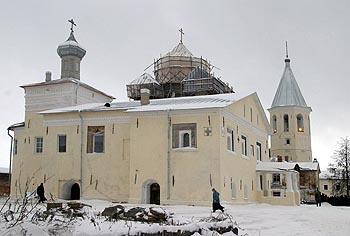 ЗЕЛЕНЕЦКИЙ СВЯТО-ТРОИЦКИЙ МОНАСТЫРЬ (ст. Зеленец, Волховский р-н). Осн. между 1565 и 1570 иноком Тихвинского мон. преп. Мартирием на Зеленом о-ве среди болот. При нем были построены (на средства купца Федора Сыркова) первые ц. – дерев. Троицкая и кам. Благовещенская, в 1601 – ц. Одигитрии на средства татарского царевича Симеона Бекбулатовича. Дошедший до нас ансамбль в осн. сложился в 1674-98 при митр. Корнилии, к-рый ранее был иноком мон. В 1684 освящен пятиглавый Троицкий собор с Иоанно-Богословской ц. в подклете, в 1686 – Благовещенская ц. Сохранились восьмигранная трехъярусная колокольня, келейные корпуса (1680-е). Мон. имел подворья в Новгороде и Тихвинском посаде, к нему были приписаны Староладожские Иоанновский и Васильевский, Гостинопольский и новгородский Спасо-Нередицкий мон. В нач. XVIII в. обитель утратила привилегированное положение. В 1771 мон. переведен из Новгородской епархии в С.-Петербургскую и назначен местом ссылки для церк. покаяния. Последний кр. ремонт произведен в 1901-02. Один из последних настоятелей – свщмч. Виктор (Островидов). Мон. ликвидирован в 1930, в 1932 храмы закрыты, внутр. убранство полностью утрачено. Здания использовалось под разные цели, последним (до 1976) здесь находился психоневрологический интернат. Возвращен епархии в 1992. Реставрированы колокольня, затем ц. Благовещения, куда были перенесены мощи прп. Мартирия и останки свят. Корнилия; воссоздана часовня. Настоятель – игумен Пахомий (Трегулов). В 2001 к мон. проложена автомоб. дорога из г. Волхов. Монастырское подворье с ц. Божией Матери «Всех Скорбящих Радость» находится в СПб. (пр. Обуховской обороны, 24).