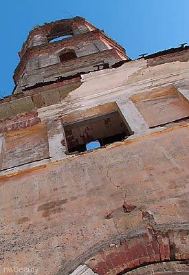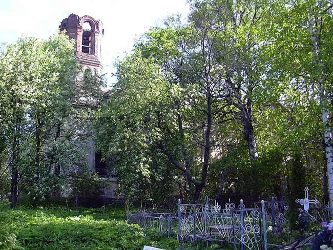 УСПЕНИЯ ПРЕСВЯТОЙ БОГОРОДИЦЫ ЦЕРКОВЬ (дер. Терёбушка, Кировский р-н). Кам. ц. построена в 1854-55, расширена в 1868 по проекту арх. К.И. Брандта. В 1879 построена колокольня по проекту арх. Г.И. Карпова (?). Не действовала с 1937, закрыта 22 дек. 1940. Здание передано под «культурное учреждение». 25 нояб. 1947 отклонено ходатайство верующих об открытии ц. Сохр. в полуразрушенном виде, пустует.