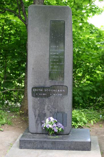 СЁДЕРГРАН (Sodergran) Эдит Ирене (1892 – 1923, Райвола), поэтесса. Родилась в СПб. в семье шведоязычных уроженцев Финляндии. Жила в Райволе (ныне – г. п. Рощино), где ее отец служил упр. лесопилкой, училась в СПб. в Петершуле (1902-08, не закончила, т. к. заболела туберкулезом). Начала писать стихи на нем. яз. под влиянием поэзии И.В. Гёте и Г. Гейне. В своих стихах С. воспела красоту природы Райволы и Карельского перешейка. Автор сб. (на швед. яз.) «Стихотворения» (1916), «Сентябрьская лира» (1918), «Розовый алтарь» (1919), «Тень будущего» (1920), книги афоризмов «Пестрые наблюдения». Стихи С. отличают свободный ритм, отсутствие традицион. рифмы. В ее поэзии отразилось увлечение философией Ф. Ницше и теософией Р. Штейнера. С. была близка модернистам, лидер к-рых Э. Диктониус посетил ее в Райволе в 1922, впоследствии редактировал ее посмертный сб. «Земля, которой нет» (1925). Похоронена в Райволе; в 1930-е могила С. была местом паломничества почитателей ее таланта. В 1940-е памятник на могиле утрачен, восстановлен в 1960. В 1992 установлен новый памятник: сидящий на гранитном постаменте бронзовый кот Тотти, любимец С.