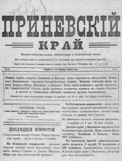 «ПРИНЕВСКИЙ КРАЙ», газета Сев.-зап. армии ген. Н.Н. Юденича. Агитационно-пропагандистское антибольшевистское изд., предназначавшееся для гражд. нас. на занимаемой терр. Издавалась в Гатчине, последние номера – в Нарве. Тираж первоначально 307 экз., затем – до 1000. В «П. к.», помимо пропагандистских статей, печатались приказы и воззвания армейского руководства, сообщения о боевых действиях, статьи на ист. темы (преим. написанные П.Н. Красновым), антибольшевистские лозунги и афоризмы. Вышли № 1-50 (19 окт. 1919 – 7 янв. 1920). Ред. – П.Н. Краснов, глава агитотдела Штаба армии. Первые неск. номеров (до 2 нояб. 1919) фактическим рук. «П. к.» был А.И. Куприн, опубликовавший в газ. ряд статей и очерков.