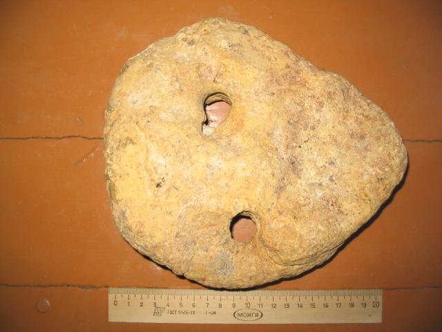 П. Шугозеро Тихвинского р-на. Музей в Доме творчества юных. Камень с двумя отверстиями из реки Явосьмы около д. Никульское Шугозерской вол.
