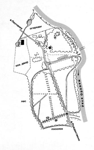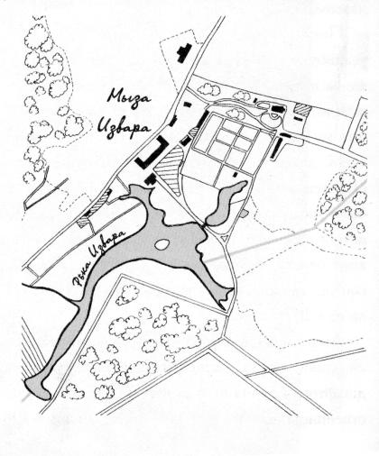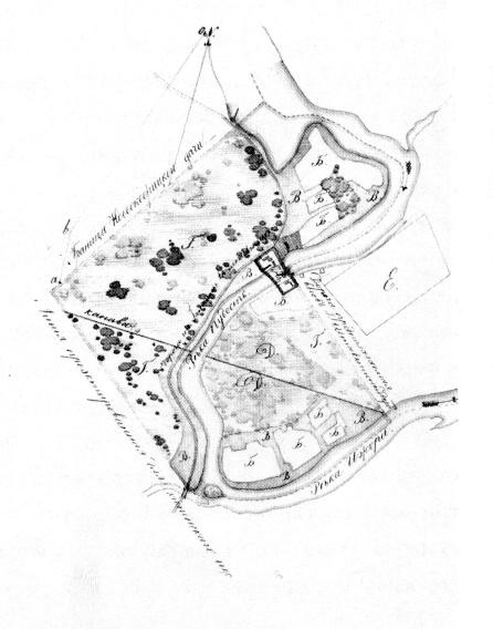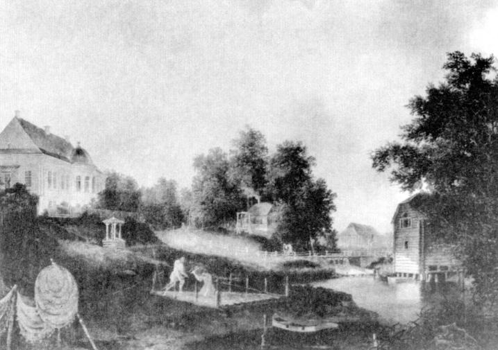 "Вид усадебного дома от ручья Поваренного". Неизв. худ. 1848