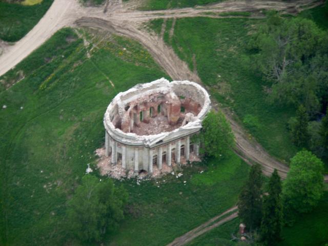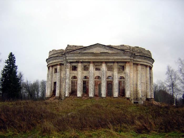ПЯТАЯ ГОРА, усадьба. Волосовский р-н, Калитинская вол. (20 км от г. Волосово). Устройство усадьбы у дер. Пятая Гора началось в кон. XVIII в. Небольшой деревянный усадебный дом находился на склоне холма, к нему вели три луча аллей. В композицию парка был включен пруд. После первых владелиц – сестер Е.М. Ренкевич и Х.М. Фок, урожд. Шнее, с 1804 хозяином П. г. стал сенатор Ф.М. Брискорн. Его вдова, Ольга Константиновна, урожд. Струкова, построила в деревне в 1827-31 каменную ц. Троицы Пресвятой – основное украшение ансамбля. Здание храма выполнено в стиле классицизма, имеет овальный план и окружено 24 трехчетвертными колоннами ионического ордера. Единый антаблемент завершен с боковых фасадов фронтонами. Освящена в 1831. Была приписана к приходской церкви в дер. Дылицы. Пришла в ветхость, закрыта в 1890. В 1902 произведен капитальный ремонт, последний – в 1921. Являлась приходской. В мае 1941 была одной из двух церквей, действующих в Волосовском р-не, готовилось ее закрытие. Не действовала с декабря 1943 из-за отсутствия священника, закрыта в мае 1945. 21 ноября 1947 Леноблисполком отклонил ходатайство верующих об открытии церкви. В наст. время здание церкви руинировано, следов имения не сохранилось.