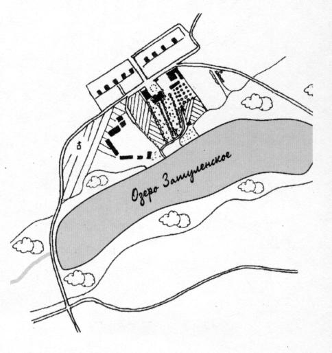 ЗАТУЛЕНЬЕ, усадьба (дер. Затуленье, Лужский р-н). Дерев. дом с колоннами на фасаде и мезонином был построен в 1810-е контр-адмиралом М.М. Муравьевым, получившим З. в приданное за женой, урожд. Пушкиной. На парадном дворе был устроен круглый партер, от к-рого начинался спуск к Затуленскому оз. в виде террасных уступов. В нач. спуска были посажены два дуба (сохр.). Небольшая усадьба (пл. 12 га) привлекала своей живописностью. В 1850 имение перешло к действительному статскому советнику В.П. Тимофееву, владевшему им вплоть до рев-ции 1917. Он значительно расширил терр. усадьбы: был построен большой хоз. двор, конюшни, каретник, молочня, ледник и др. В 1859 возведена часовня над могилой жены хозяина З. Подробное описание З. с фотографиями было помещено в 1915 в журн. «Столица и усадьба». Дерев. постройки не сохр., частично уцелел парк, тесно связанный с озерным пейзажем.