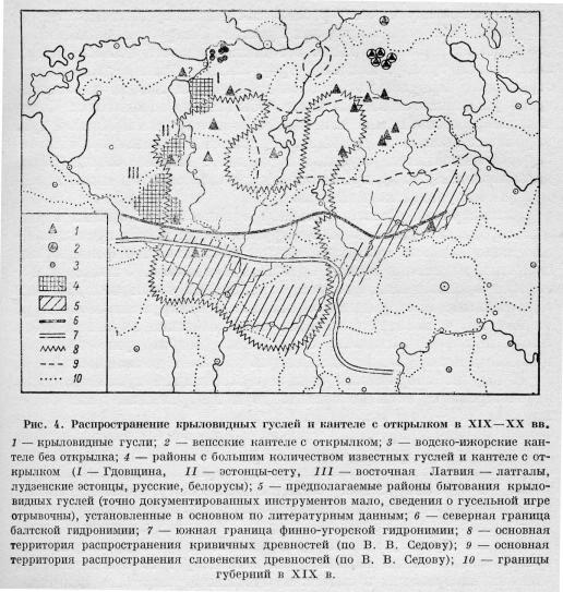Распространение крыловидных гуслей и кантеле с открылком XIX-XX вв. Карта-схема