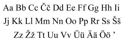 Латинский алфавит с исключением букв "q", "w", "x", "y", с шестью дополнительными буквами. Буквы "u", "a", "o" с точками обозначают передние гласные, диакритизированные "c", "s", "z" соответствуют русским "ч", "ш", "ж". Знаком ’ обозначается мягкость предыдущего согласного.