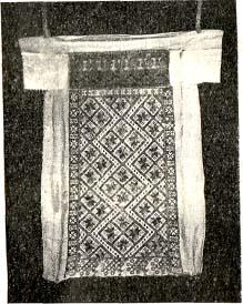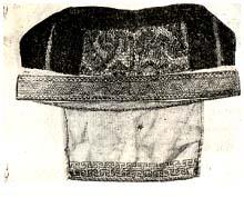 Своеобразный тип представляет собою «саппано» (sappano),— головной убор ижор Ораниенбаумского района. Этот головной убор, носившийся вместе с ааннуа, в настоящее время совсем уже вышел из употребления, хотя единичные экземпляры его еще можно найти в некоторых деревнях. Публикуемый нами саппано имеет в длину 1,58 м, и состоит из полотенца шириной 41 см, верхний край которого сложен вдвое по нитке утка, и зашит. Нижний край его сложен втрое по нитке основы, на протяжении 49 см, и смётан. В лобную часть вшит кусок синего узорного тканья, вышитого белой и желтой нитками. От этой лобной вставки по бокам пришиты куски темного коленкора и завязки, при помощи которых саппано завязывается на затылке. Средняя часть полотенца и конец его вышиты белым шитьем по выдерганному. К концу пришит кусок холста длиной 36 см, наружная сторона которого украшена узорной тесьмой, кружевом, шелковыми ленточками, а к нижнему краю пришита бахрома из шелковых крученых ниток. При надевании саппано, хвостовая часть его затыкалась за пояс.